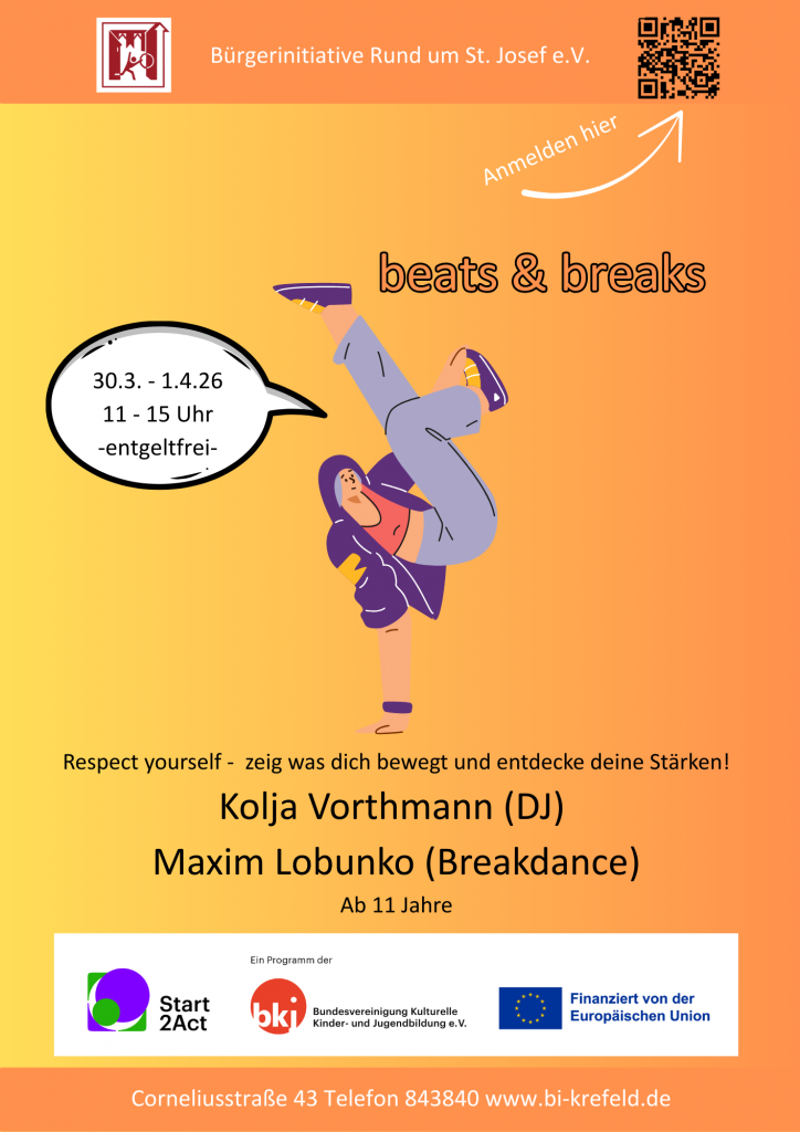 In der 1. Ferienwoche starten montags wir mit einem 3-tägigen DJ- und Breaking-Workshop. Wir setzen uns kreativ mit den Themen Respekt, Grenzen, Selbstbestimmung und Ausdrucksfähigkeit auseinander. Unter professioneller Anleitung werden grundlegende Skills im DJing und Breaking vermittelt und zum Abschluss eine selbst erarbeitete Breaking Choreografie zu einem eigens erstellten DJ-Set präsentiert. Ab 11 Jahre
